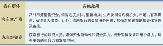1.融资支持:汽车生产商希望银行为其经销商提供融资支持,增强经销商的购车能力,促进经销商车辆销售,从而帮助生产商增加销量,提高销售收入和扩大市场份额。