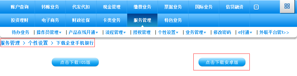 下载路径1:登录企业网银,通过“服务管理-个性设置-下载企业手机银行”菜单下载客户端。