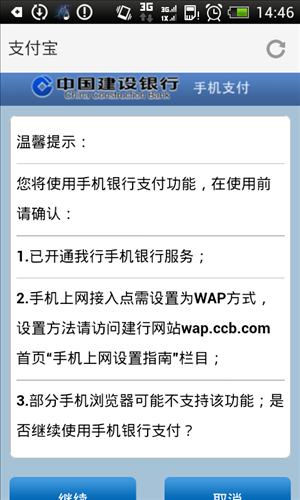 2.使用手机银行进行支付前,需要确认以下信息,确认无误后可以点击“继续”。