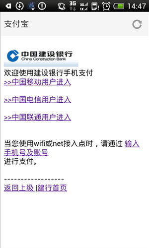 1.您通过手机在商户网站进行支付,选择建行手机支付,系统会自动跳转至我行的手机银行支付页面,您可以点击“手机银行支付”。