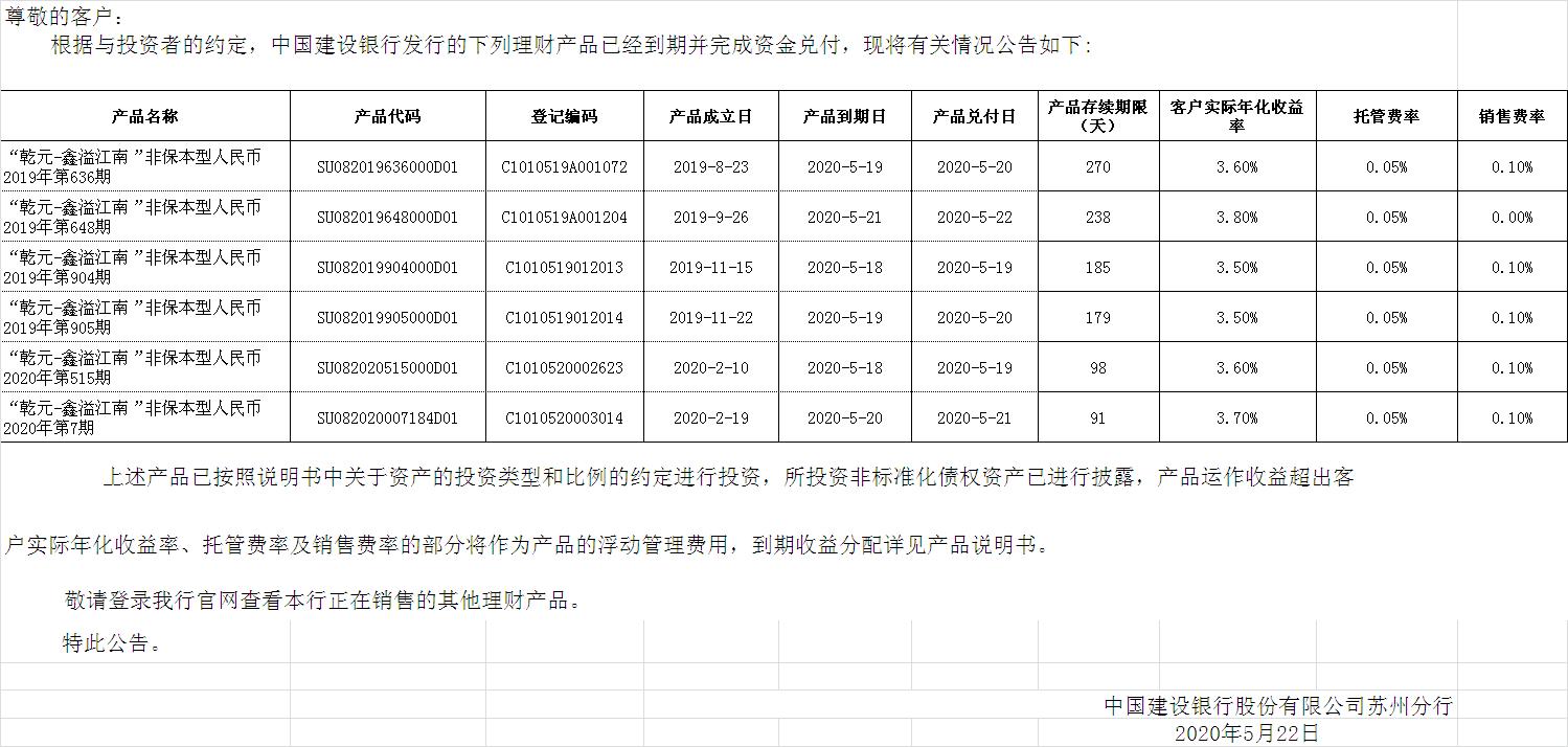 中国建设银行理财产品终止及清算公告